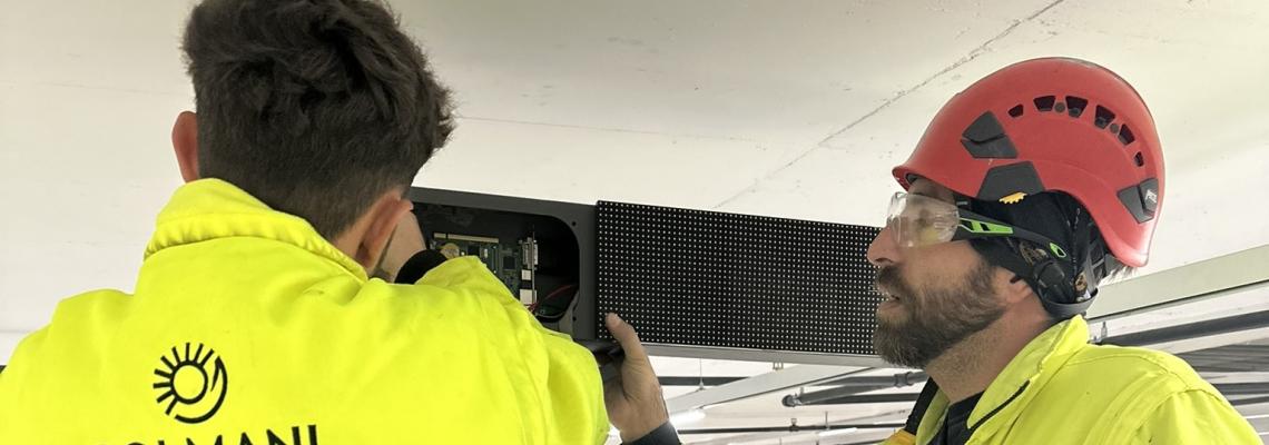 Nos experts réinstallent les bandeaux LED qui guident les automobilistes en temps réel vers les places disponibles. Suite aux importants travaux au sein du parking, ceux-ci avaient été démontés.