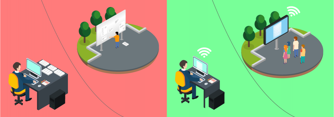 Un pilier public numérique (écran LCD extérieur) dont le contenu est géré directement depuis un navigateur internet.